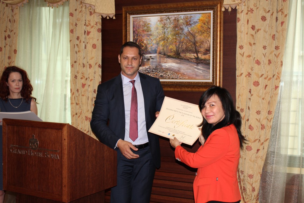 Заместник-министърът на туризма Александър Манолев отличи с грамоти участниците в Международния кулинарен фестивал „България посреща вкусовете на света“. Наградите бяха връчени на представителите на дипломатически мисии у нас и на общините домакини на фестивала, които се включиха в инициативата.