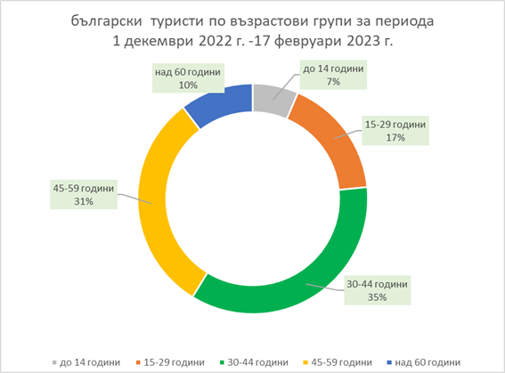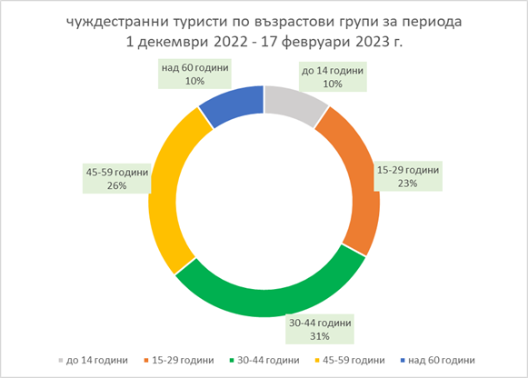 Най-висок интерес има от туристи на възраст между 30 и 44 г. Данните за възрастовата структура на българските и чуждестранните туристи за периода 1 декември 2022 – 17 февруари 2023 г. е представена чрез графики.