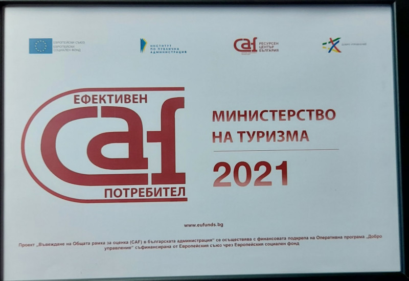 Министерство на туризма получи етикет „Ефективен CAF потребител“, след като бе извършена външна оценка на администрацията относно прилагането на модела CAF въз основа на Националните правила за външна обратна връзка.