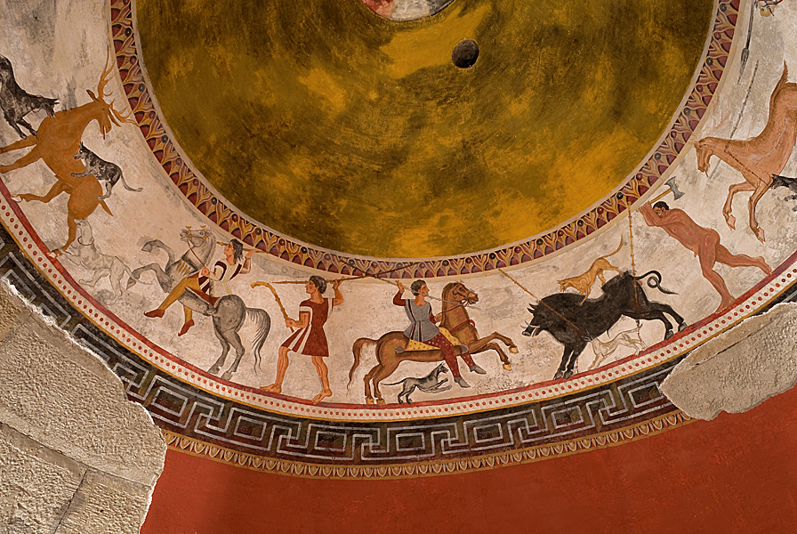 Най-разнообразни са стенописите в кръглата камера – тя е изографисана в шест хоризонтални пояса с различна широчина, разположени един над друг. Повечето фрески изобразяват ловни сцени.
