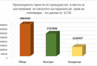 Общо над 3,8 млн. туристи са пренощували в места за настаняване в страната от началото на 2020 г. до края на септември, сочат данните от Единната система за туристическа информация (ЕСТИ). Повече от 2,7 млн. от тях са българи и над 1,1 млн. – чужденци. В дялово отношение нашите сънародници представляват 71%, а чужденците – 29 на сто.