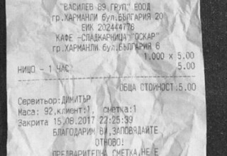 По инициатива на министъра на туризма Николина Ангелкова започва проверка за категоризацията на заведение в град Харманли, за което клиент твърди, че е получил сметка за престой без консумация. Според сигнала, подаден до Министерство на туризма, на 15.08.2017 година, посетителят е платил 5.00 лв. за „нищо- 1 час“, както е отбелязано на касовата бележка, приложена към сигнала. От сметката се вижда, че от кафе-сладкарница „Оскар“ са поискали сумата в 22.25 часа.