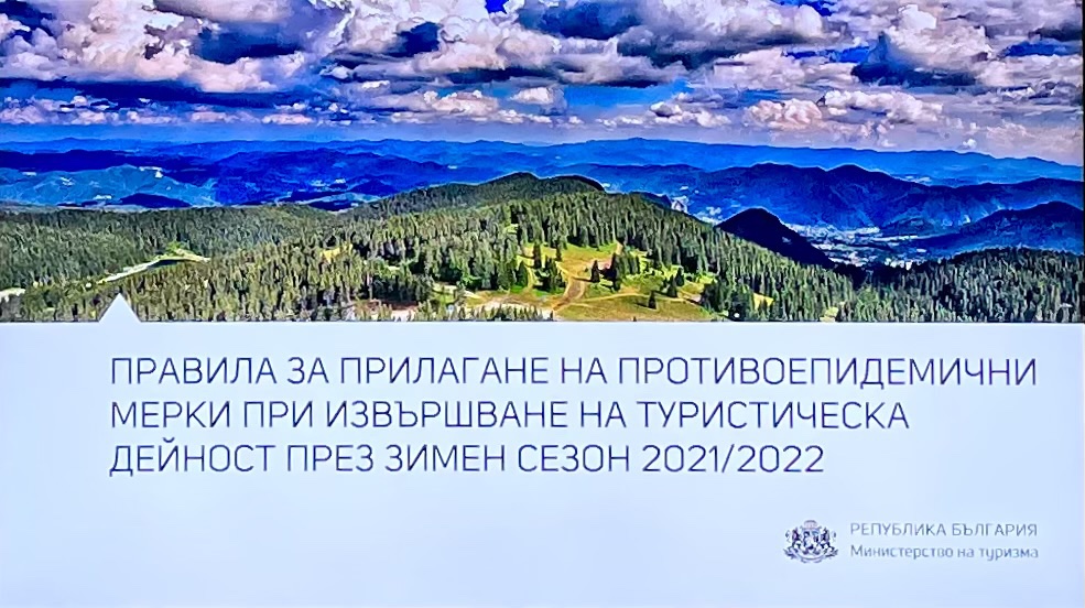 На онлайн среща с представители на зимните ски курорти в България министърът на туризма Стела Балтова представи Правилата за прилагане на противоепидемични мерки при извършване на туристическа дейност през зимен сезон 2021/2022 и обсъди подготвения Здравен протокол за зимния сезон. Предстои съгласуването му с Министерството на здравеопазването и до дни той ще бъде окончателно утвърден.