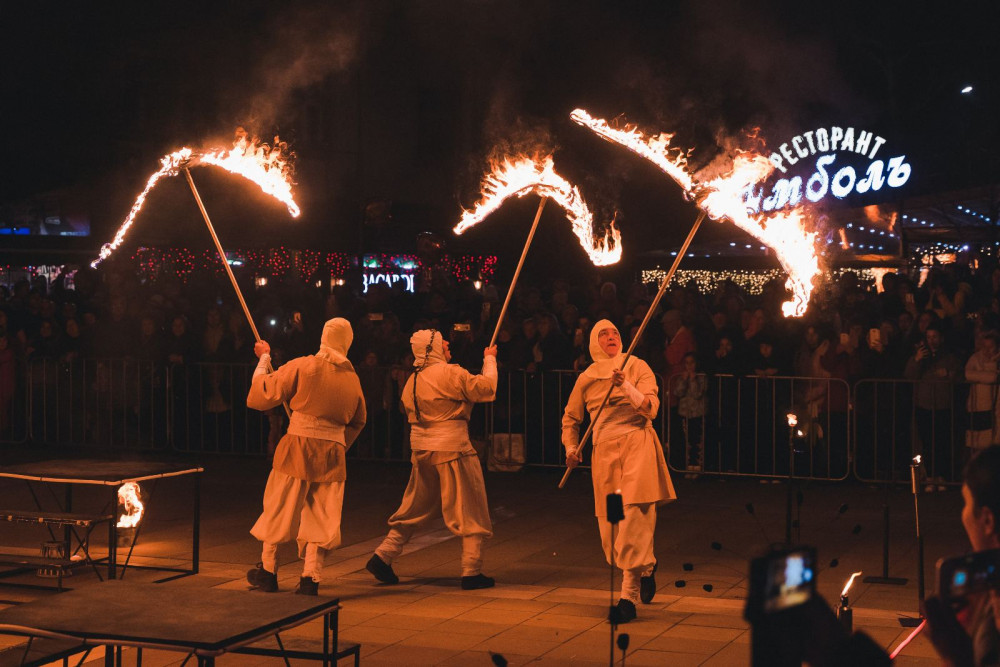 В първата фестивална вечер карнавално шествие тръгна от улица „Търговска“, предвождано от емблематичните ямболски гигантски маски и Гайдарски състав при Национално училище за фолклорни изкуства „Филип Кутев“, Котел. Шествието приключи пред сцената до община Ямбол, за да започне огненият спектакъл на „ЖАР театър“.