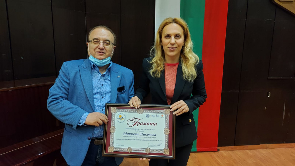 Министър Николова бе отличена и с грамота от Съюза на хотелиерите к.к. Златни пясъци за възстановяване на доверието в Министерството на туризма.